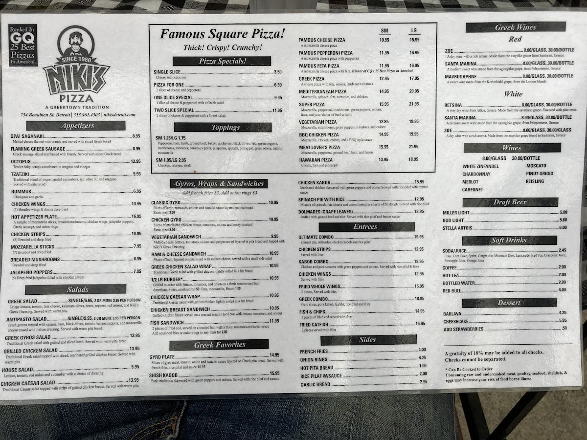 Niki's Pizza offers a menu that blends comforting, casual bites with a touch of Greek flair, ideal for both quick lunches and relaxed dinners. The menu features a variety of hearty Detroit-style pizzas, such as the classic Pepperoni or the Meat Lover's, alongside Greek favorites like Spinach Pie with Rice and traditional salads topped with grilled chicken or lamb. This combination makes it a welcoming spot whether you're sharing a meal with friends or grabbing a satisfying slice on the go.